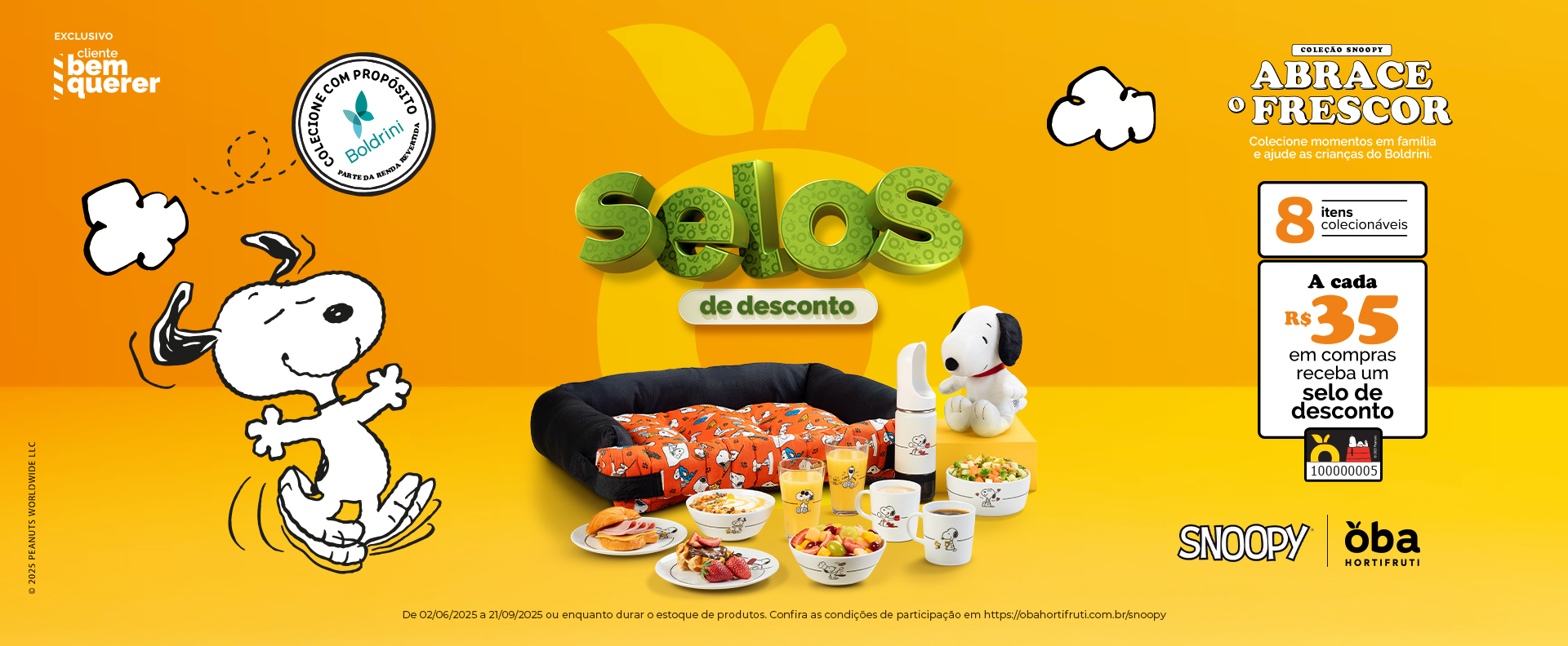 Período para acumular selos de desconto e comprar os produtos participantes: De 02/06/2025 a 21/09/2025 (ou enquanto durar o estoque de produtos Peanuts). Consulte todas as regras de participação em https://obahortifruti.com.br/snoopy ou no balcão de atendimento das lojas participantes.