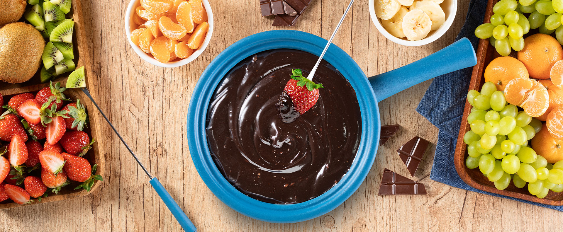 E para a sobremesa, você poderá escolher entre uma variedade de frutas frescas, como Damasco, Morango, Kiwi, Uvas sem Semente Oba Bem Querer e Banana. Além disso, a nossa linha exclusiva de chocolates com qualidade Callebaut garantem um toque especial ao fondue, trazendo doçura e cremosidade na medida certa.