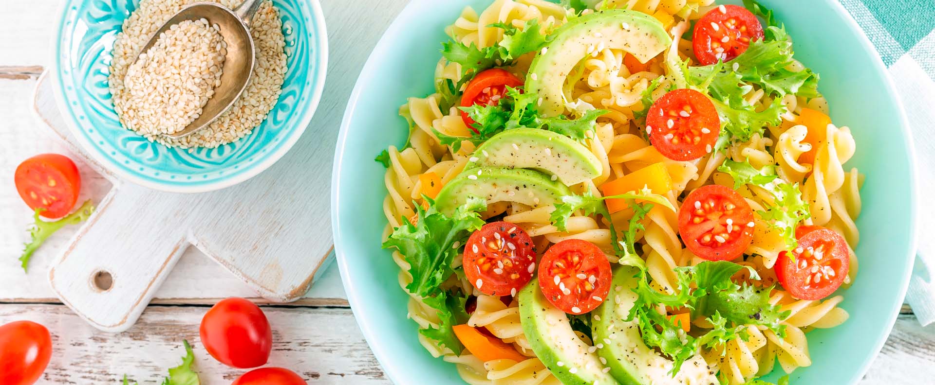 - Em uma tigela grande, misture o macarrão já frio com os tomates, o abacate e as folhas de salada.