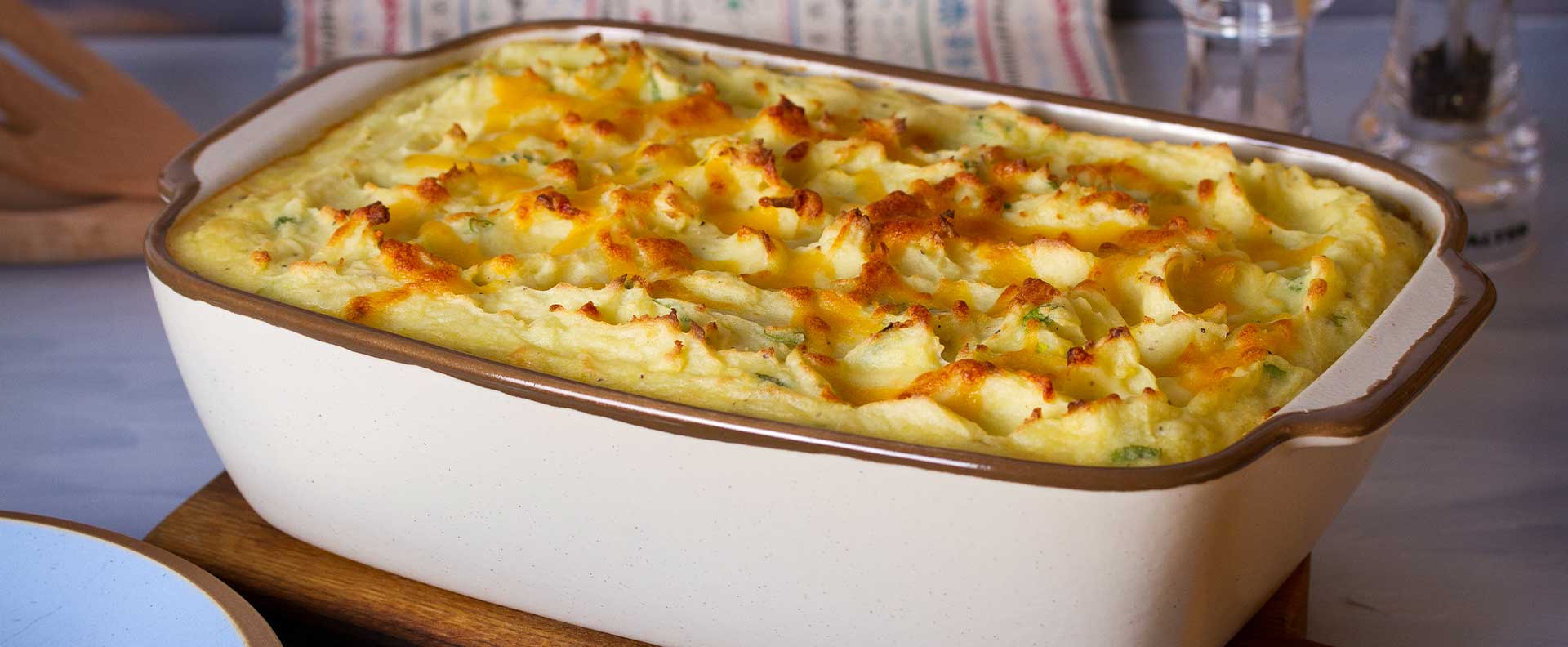 - Em uma forma untada, coloque uma camada de purê de batatas.
